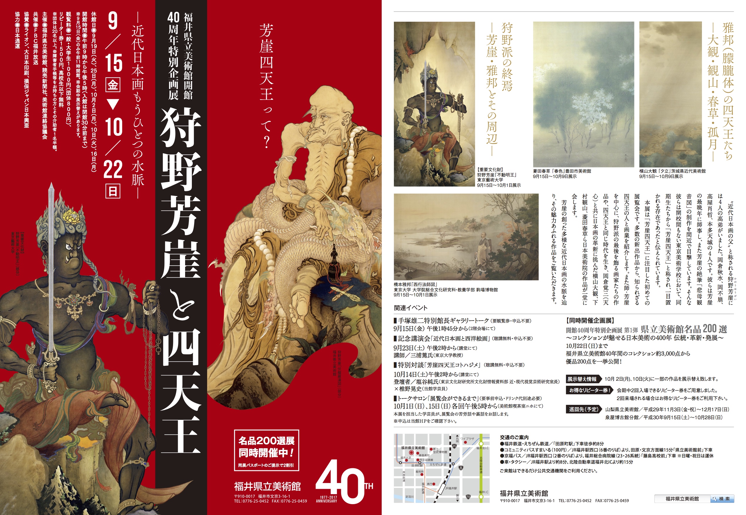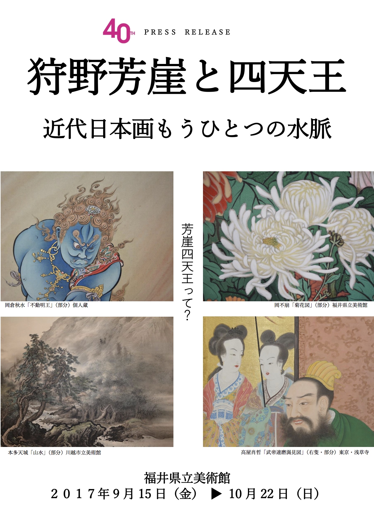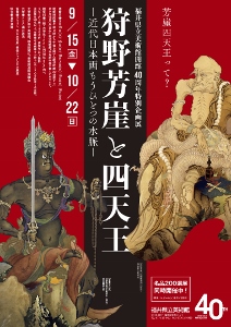 “近代日本画の父”と称される狩野芳崖の下には4人の高弟がいました。岡倉秋水、岡不崩、高屋肖哲、本多天城の4人です。彼らは芳崖の最晩年に師事し、また芳崖の絶筆「悲母観音図」の制作を間近で目撃しています。そんな彼らは開校間もない東京美術学校において、同期生たちから「芳崖四天王」と称され、一目置かれる存在であったと伝えられています。狩野芳崖と四天王―近代日本画もうひとつの水脈― 本展は「芳崖四天王」に注目した初めての展覧会です。多数の新出作品から、知られざる四天王の人と画業を紹介します。また師・芳崖を中心に、狩野派の最後を飾る画家たちの作品や、四天王と同じ時代を生き、岡倉覚三(天心)と共に日本画の革新に挑んだ横山大観、下村観山、菱田春草ら日本美術院の作品を一堂に会します。 芳崖の創った近代日本画の水脈を辿り、その魅力あふれる作品をご覧いただきます。