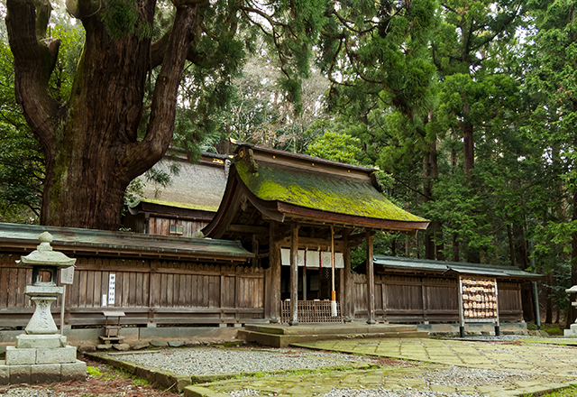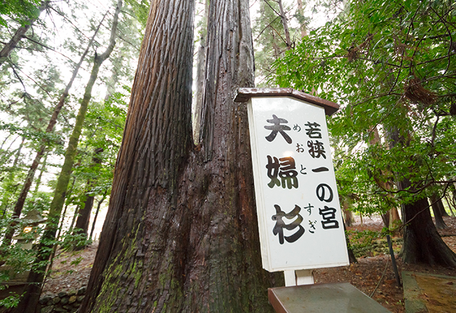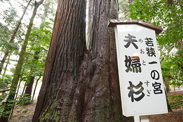 2社を合わせて若狭一の宮と呼ばれる「しあわせの聖地」認定スポット。まず姫神社、次に彦神社の順にお参りすると良いらしい。杉の木立に囲まれた彦神社には、根元が一つになった神木・夫婦杉がある。夫婦でお祈りすれば、円満な関係を続けていけるそう。