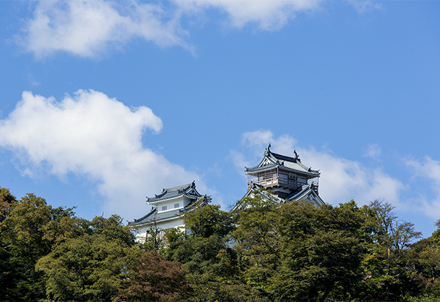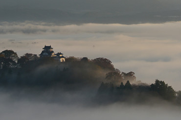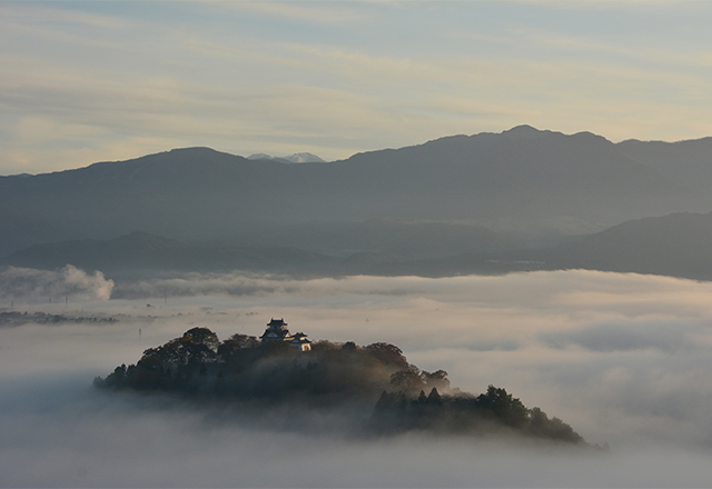 大野市の亀山に建つ「越前大野城」。前日に雨が降った天気のいい早朝、運が良ければ雲海に浮かぶ「天空の城」を眺められる。城の向かいの犬山にあるビューポイントへは、ふもとの駐車場から歩いて20分。めったにお目にかかれない絶景が見られたらラッキーな1日に。「しあわせの聖地」認定スポット。