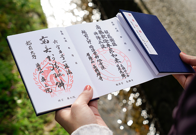 さまざまな宗派の寺が並ぶ寺町は、かつて城下町・大野を守る“砦”でもあった。今は寺の前に置かれた「御朱印」を自由に押せるオープンな雰囲気。大野市観光協会では専用の「御朱印帳」が手に入る。お気に入りを探して巡ってみよう。