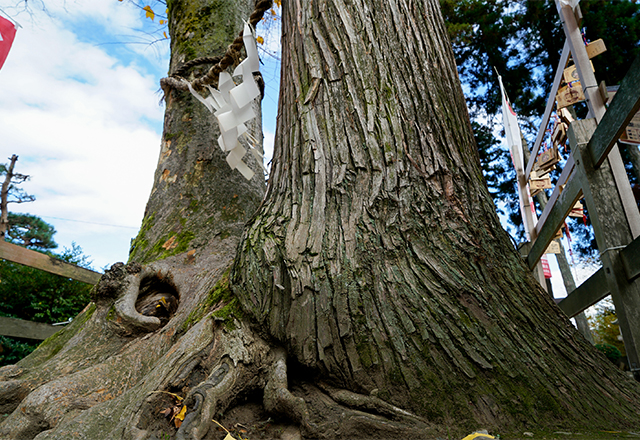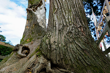 春日神社の境内にある「良縁の樹」は、樹齢100年以上のスギとケヤキが根っこで結ばれている。重なった根っこに触れると、恋愛や仕事、人間関係など、さまざまな良縁に恵まれるらしい。「しあわせの聖地」認定スポット。
