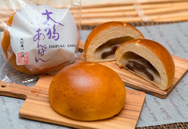フランスのお祝いの席でよく食べられる、卵とバターたっぷりのブリオッシュ生地。「大福あんぱん」は、そのおめでたい生地で大福を包みこんだ“幸福づくし”のおいしさだ。「しあわせの逸品」に認定されている。