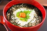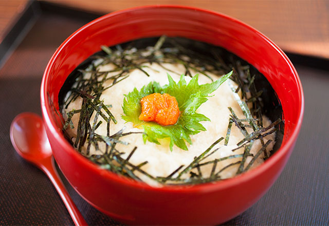 鯖江市河和田地区に伝わる、ユズと赤なんば、唐辛子と塩でつくる調味料「山うに」。ご当地ならではのおいしさは、鍋や味噌汁にも合う。喫茶椀椀では、なんとヤマイモの丼にトッピング。持ち帰り用の「山うに」も購入できるので、お土産にもってこいだ。
