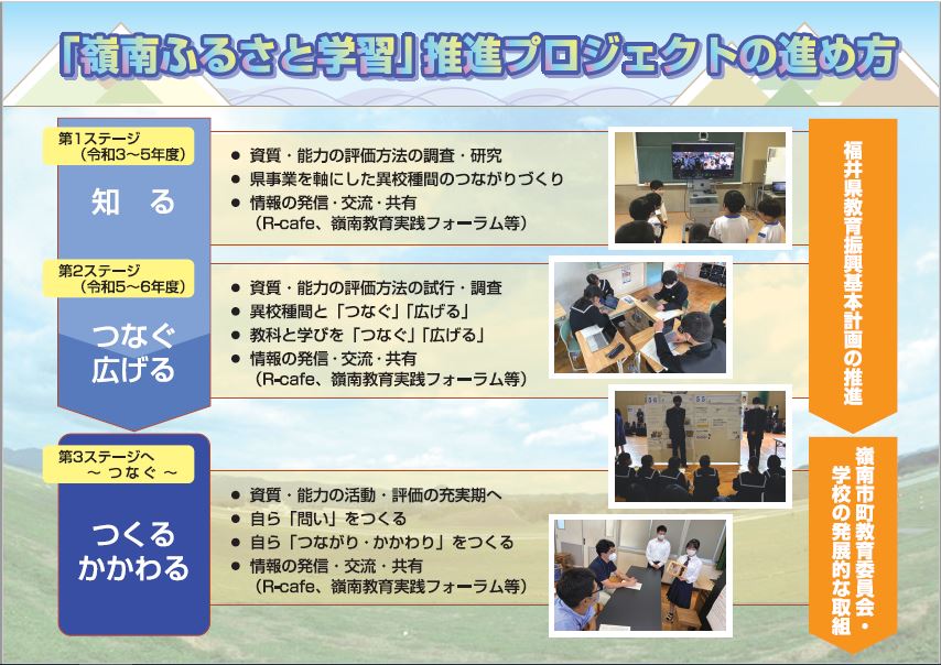 『嶺南ふるさと学習』推進プロジェクトは、嶺南の小中学校・県立学校、嶺南地区の教育委員会、嶺南教育事務所が参加する「探究的な学び」の推進プロジェクトです。嶺南の子どもたちに「ふるさとへの誇りや愛着」を育むとともに、「未来を生きるために必要な資質・能力(自律する力、協働する力、創造する力)」の育成を目的としています。
