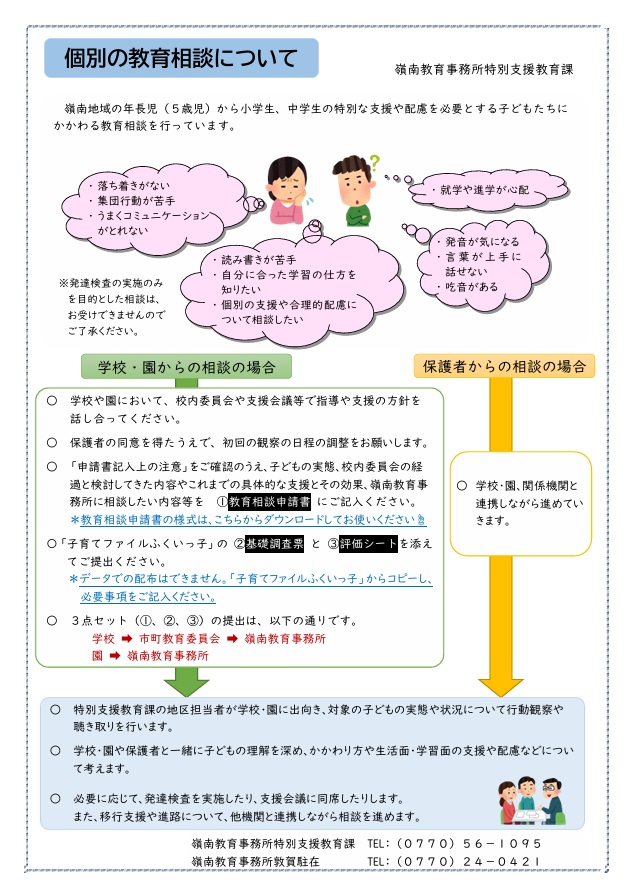 | 個別の教育相談へ | こどもとそだちの相談会へ | 特別支援教育の学校説明会へ |