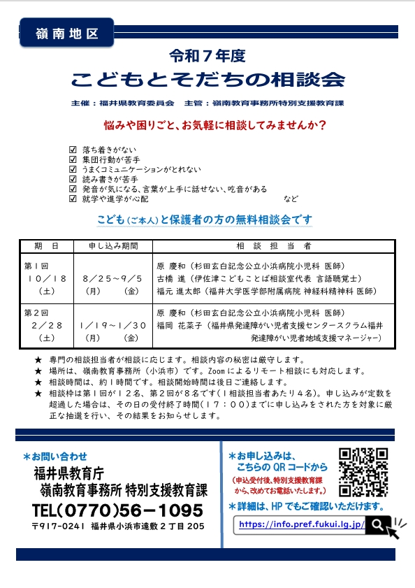 原 慶和 (杉田玄白記念公立小浜病院小児科 医師) 福岡 花菜子 (福井県発達障がい児者支援センタースクラム福井 発達障がい児者地域支援マネージャー) |