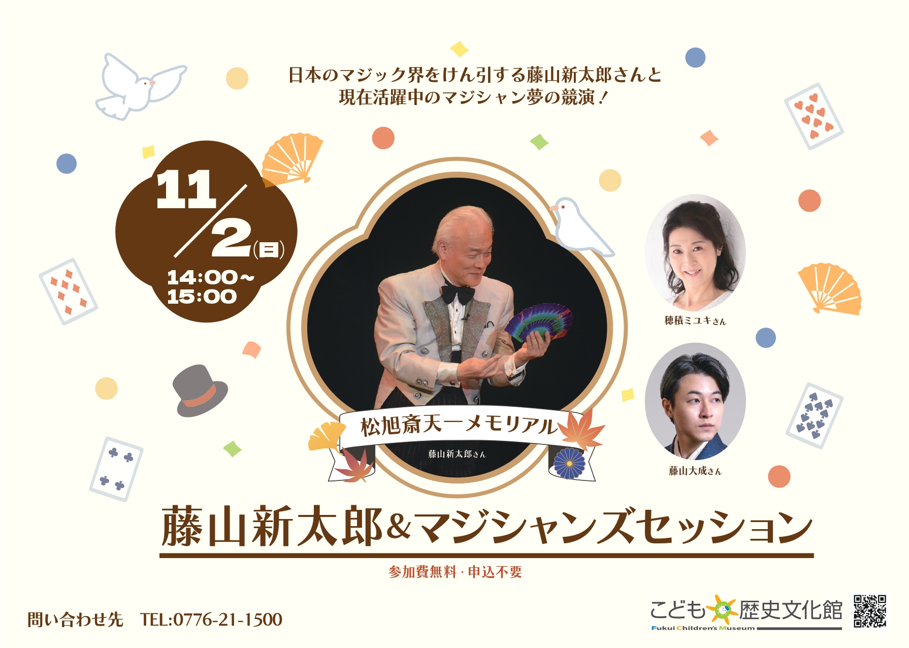 内容 明治時代に世界を舞台に活躍した、ふくいゆかりの奇術師・松旭斎天一(1853-1912)の業績を記念して、天一から数えて5代目の弟子にあたる藤山新太郎氏と現在、活躍中のマジシャンの皆さんを招いてマジックショーを開催します。