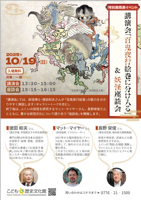 | 内容 | 特別展開催を記念して、中世説話や民間伝承の妖怪を研究する徳田和夫氏(学習院女子大学名誉教授)に、「百鬼夜行絵巻」の魅力やおもしろさについて語ってもらいます。講演後には、ふくいの妖怪を世界に発信しているマット・マイヤー氏(妖怪絵師)と長野栄俊氏(福井県文書館職員)を交え、3人の妖怪博士たちの座談会も行います。 |