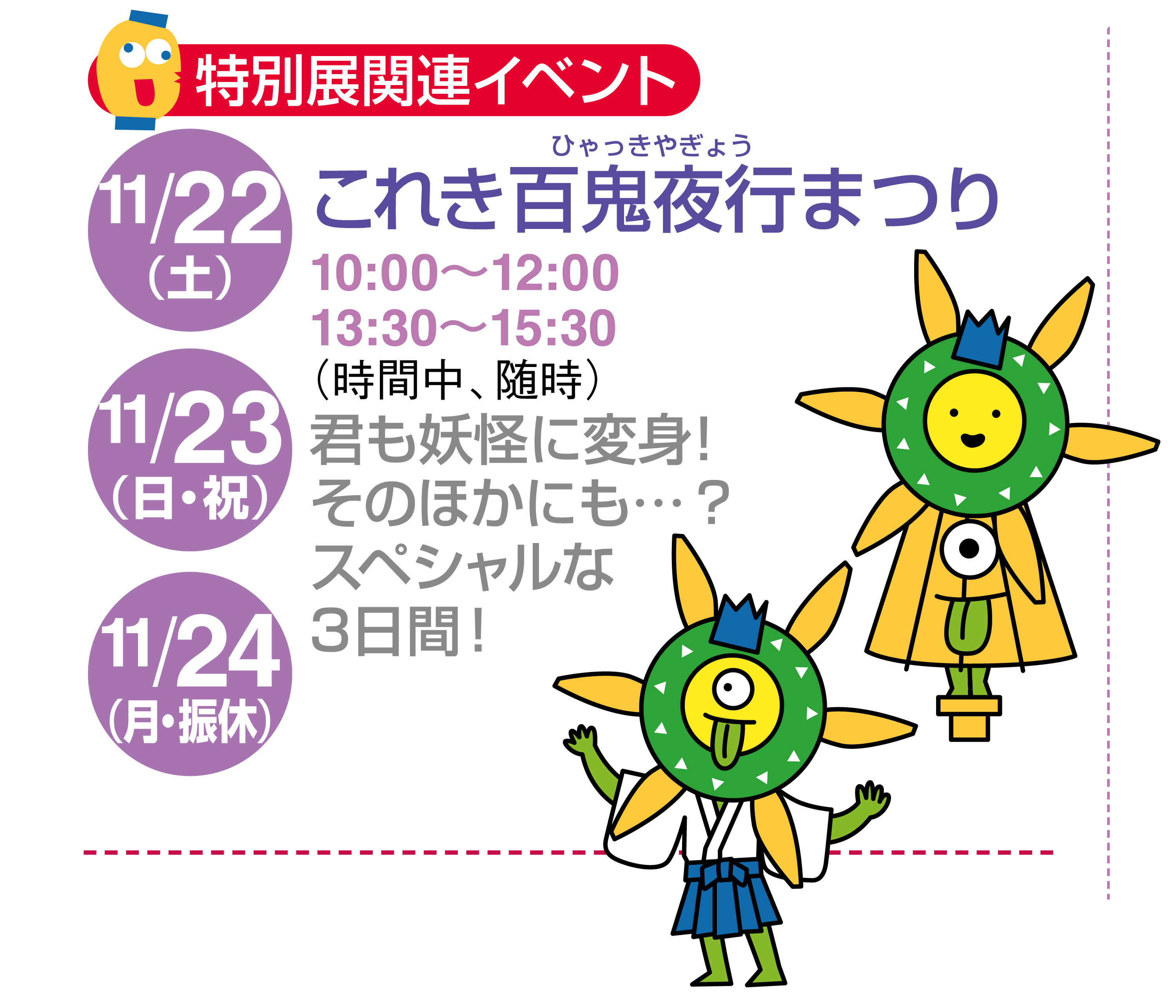 内容 特別展「続ッ!妖怪、ずらり。」の関連イベントです。妖怪に自由に変身したり、妖怪をテーマとしたゲームに参加したりすることで、楽しみながら特別展への興味と妖怪文化への関心を深めていただく機会とします。