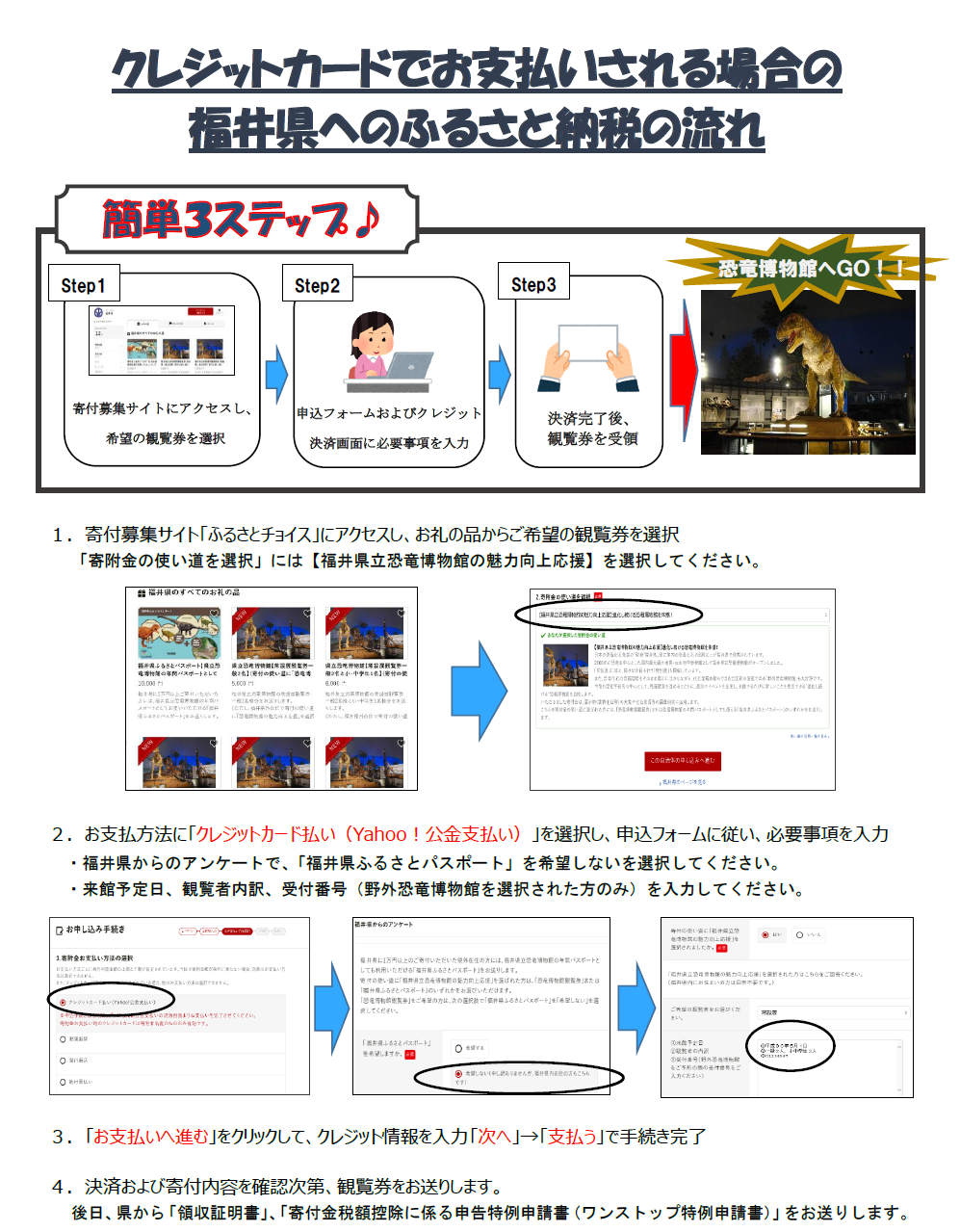 | 福井県では、「ふるさと納税」を通じて、恐竜博物館を応援していただくことができます。いただいた寄付金は、恐竜博物館の展示物(実物化石等)の充実や化石発掘等の調査研究など、恐竜博物館の魅力を高める取り組みに活用させていただきます。皆様の応援をよろしくお願いします。 |