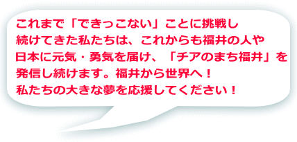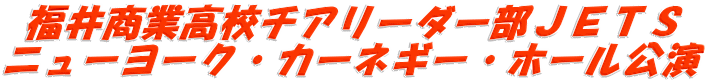 | 福井商業高校チアリーダー部JETSにご支援、ご声援をいただき、誠にありがとうございます。 おかげさまで、ニューヨーク・カーネギー・ホール公演で最高のパフォーマンスを届けることができました! これからも、笑顔や勇気を福井の人や日本に届けられるよう、挑戦し続けます。 |