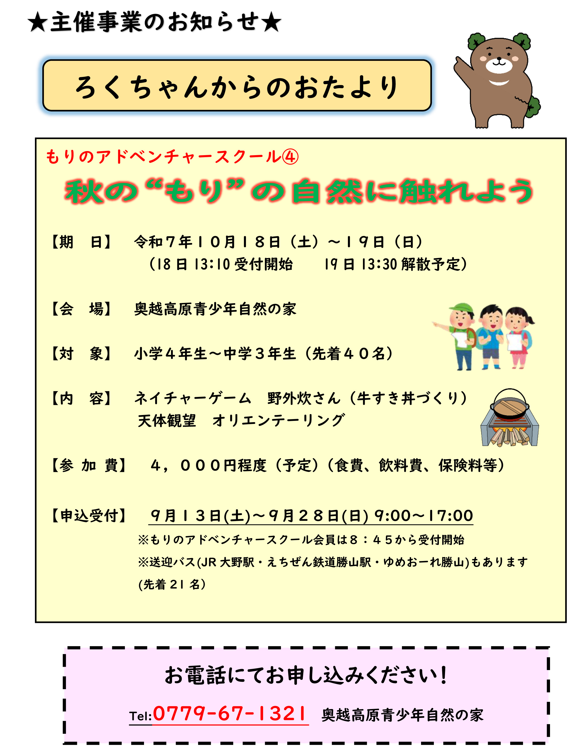 - ☆10月18日(土)~19日(日)に、「もりのアドベンチャースクール④」を開催します。 詳しくはちらしをご覧ください。募集は9月13日(土)9:00より開始します。 (もりアド会員は8:45より申込可) お電話にて申し込みください。