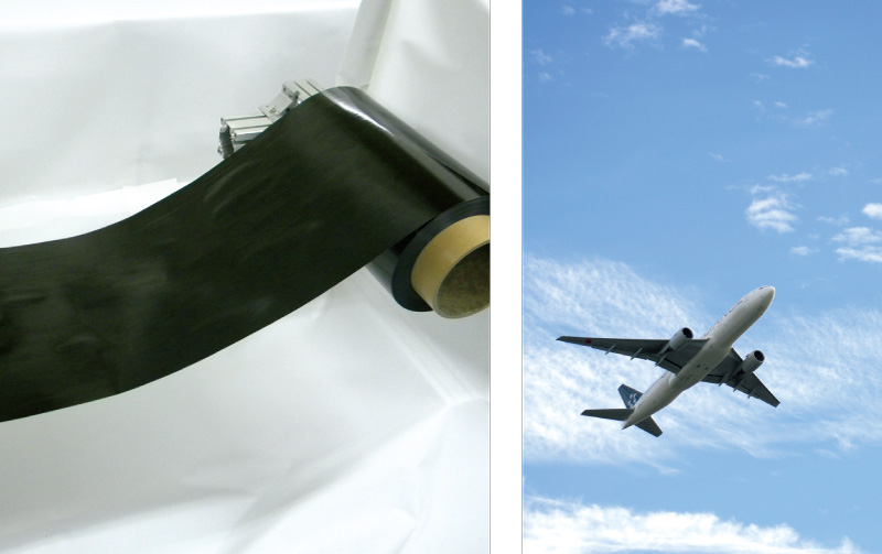 福井県が開発した空気流による開繊技術を活用し、(株)IHIと共同で、低コストかつ軽量、高性能な耐熱熱可塑性樹脂炭素繊維複合材料を開発。均一な厚みで反りがなく、欠陥の出にくい薄層プリプレグシートの高速量産を実現しました。鳥の衝突など耐衝撃性に強い一方で、部材の軽量化も両立。大手航空機エンジンメーカーに認められ、航空機エンジンの構造案内翼部材に採用されました。当社の部材が、世界のフライトを支えています。