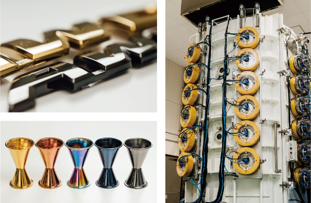 プラスチック製品へのイオンプレーティング加工(低温処理技術)を業界で初めて事業化。独自で開発した装置と、その装置のオペレーションプロセスノウハウにより加工を実現しました。この加工ができる会社は国内で数社しか存在せず、当社以外の会社は、当社が納入した装置により加工を行っているため、当社のオンリーワン技術として、カーエンブレムをはじめとした様々な製品に活用されています。