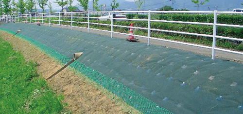 雑草の出芽力を測定し、その抑止を可能とするシートを開発するため、京都大学と共同研究を行いました。その際に開発された高密度の繊維によるシートは、チガヤを防ぐ強度はあるものの、硬くて破損し易いという弱点がありました。これをカバーするために、表層に柔不織布を貼り合わせて2層の構造として、耐久性(耐用年数)の向上を実現しました。
