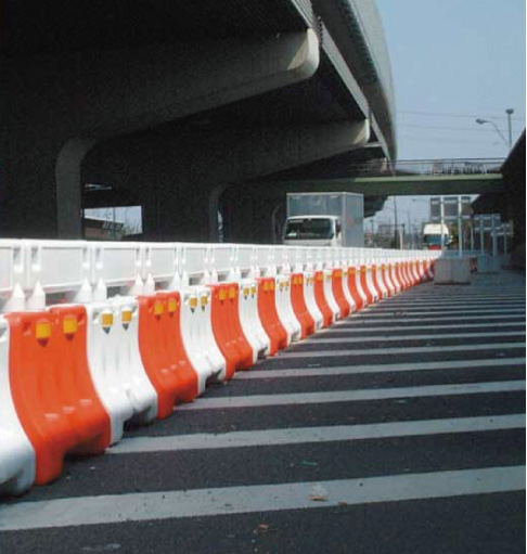しかし、従来の樹脂製の製品は壊れやすく、特に寒冷地に弱いという弱点がありましたが、当社はそれを解決する製品を業界に先駆けて完成。工事現場の安全のための防護柵をはじめ、高速道路インターチェンジや駐車場の区分帯として使われています。