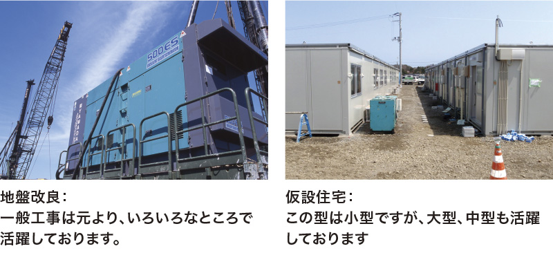 デンヨーのエンジン発電機は、台風・地震・火災などの災害時・病院の医療機器・ビルの排煙装置・オフィスや工場のコンピュータ・銀行のオンラインシステムなどの非常用電源としてさまざまな施設に導入されています。他の原動機と比較して熱効率が高く、燃料消費率が少なく経済的です。また、燃料は軽油やガソリンなどで容易に入手でき、国内シェアNo.1を誇っています。