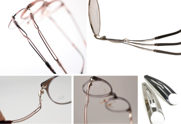 理想の掛け心地の追求“しなやかなバネ性”と“適度なホールド性”を兼ね備え、ストレスのないメガネを開発するため、我々はヘアピンの構造に着目しました。ヘアピンは“反発”と“形状維持”の機能を持っています。この機能は、長さが違う2つのアーチ(弓形)を組み合わせるという、シンプルな構造から生まれています。この構造をフレームのテンプルに応用。試作と検証を繰り返し、テンプルがスムーズに開閉し、“しなやかなバネ性” と“適度なホールド性” を兼ね備えた、理想の掛け心地をもつ設計と構造にたどり着きました。