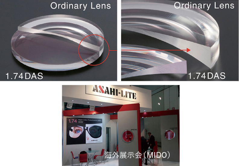 当社は、1987年に世界で初めて高屈折率の薄型レンズを製造し、また1994年にはさらに屈折率を高めた世界初の超薄型レンズを開発、そのレンズは日本メーカーとして初めて全米眼鏡業協会の最優秀レンズ賞を受賞しました。