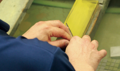 当社の理容・美容用のハサミはおよそ100数種類あり、そのほぼ全てが個別受注生産によるものです。理容・美容の競技技術者や一日に何十人もの髪の毛をカットするプロの技術者のハイレベルな要求に応えている当社のハサミは、熟練した職人が高い技術力で一丁一丁手作りで仕上げています。特にその技術のベースとなっているのが刃の裏側に微妙なひねりを生み出す「裏スキ加工」で、当社は国内で唯一、完全手スキにより裏スキ加工できる技術を持っています。