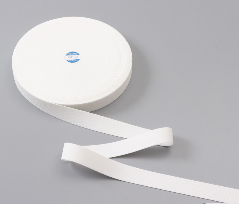 従来、ウエストに使われる平ゴムの中折れを防止する為、平ゴムに厚みを持たせたり、風合いを硬くすることで対応していましたが、お客様より「ウエスト部分が硬くなる」、「アタリが出る」等の声が寄せられました。この問題を解決すべく開発した商品がONPシリーズです。この平ゴムは従来品とは比較にならない曲げ反発性を保持しており、幅方向の折れ曲がり防止は勿論、あたりの出難さ、ソフトな風合いを実現させています。現在、ONPシリーズは大手アパレル、ユニフォームメーカーにて採用が進んでいます。
