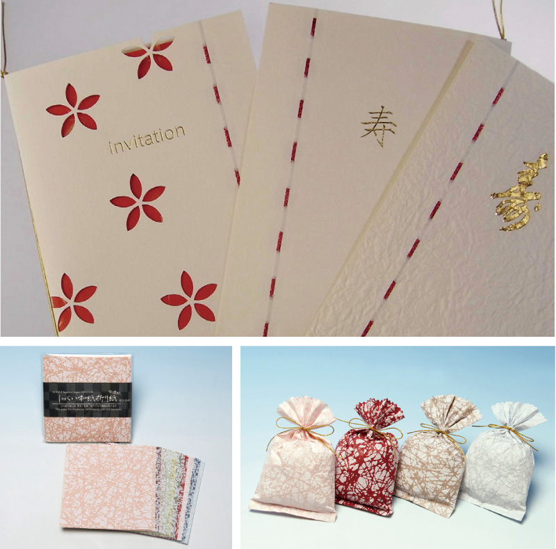 上質な「つや」と手触り感の良さを特徴とする和紙(局紙)は、これまで株券などに使われてきました。偽造防止のため、企業のロゴを透かしとして入れたほか、角度が変わると色や模様が変わる「ホログラム」加工を施した製品を生産してきました。このようなホログラム入り和紙の製造ができるのは当社を含め全国で3社しかありません。こうした技術を活かして、リボンを抄き込み、透かしの入ったグリーティングカードを提案しています。また、透かしの入った卒業証書も生産しており、全国の国公私立大学に採用されています。機密文書の管理用に、ICタグを漉き込んだ用紙を開発。特許を取得しています。