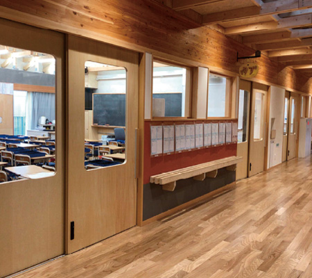 ゼロVOC不燃粉体焼付塗装は、真に環境負荷を低減できる唯一の塗装です。当社のハートフルテクノロジーにより、建物内装材に求められる環境性能・不燃性能を考え、すべての枠・扉で標準採用しました。使いやすさや安全性の実現だけでなく、美しさと心地よさをプラスした学校間仕切・建具をご提案します。