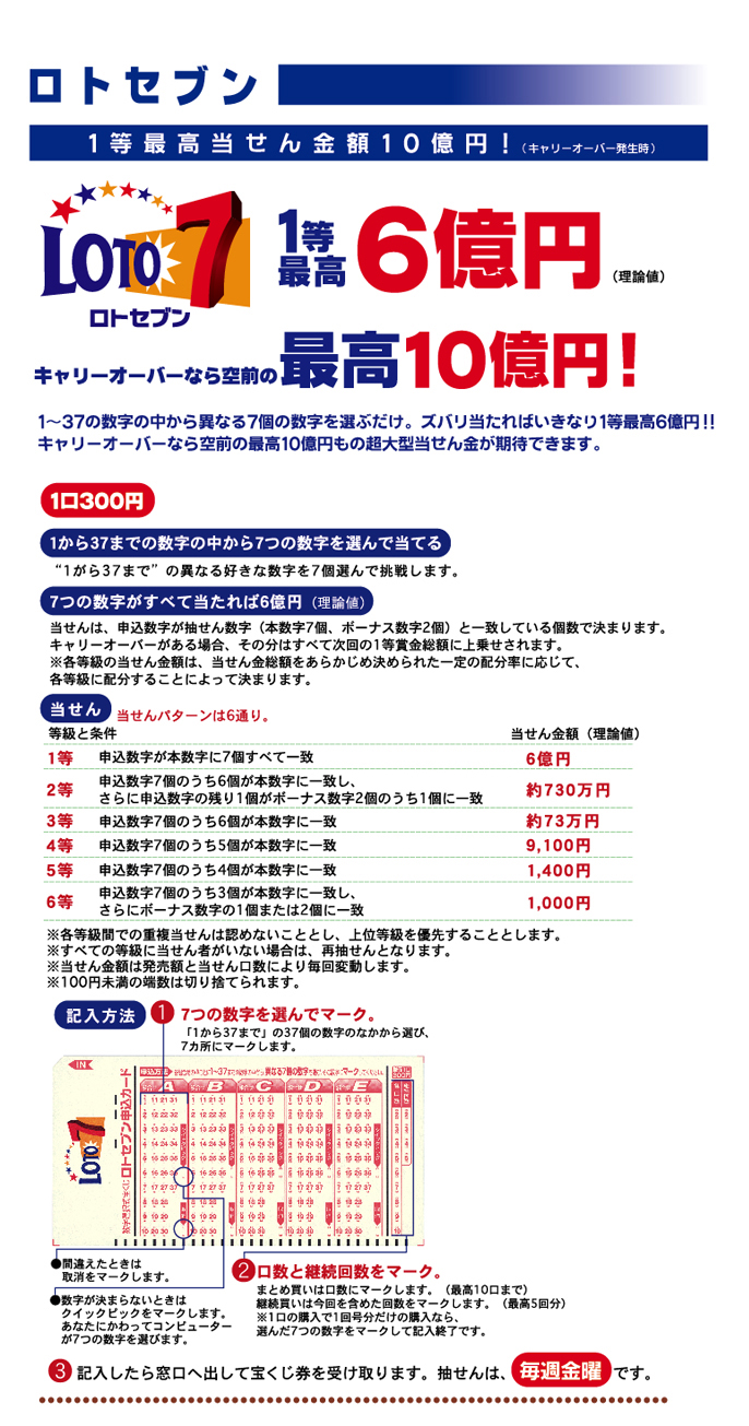 ロトセブン 最高当せん金額10億円! 1〜37の数字の中から事なる7個の数字を選ぶだけ。 ズバリ当たればいきなり1等最高6億円(理論値) キャリーオーバーなら空前の最高10億円もの超大型当せん金が期待できます。 お求め方法は申し込みカードに7つの数字を選んでマーク。 間違えたときは取消をマークします。 数字が決まらないときはクイックピックをマーク。 あなたにかわってコンピューターが7つの数字を選びます。 口数と継続回数をマークすれば終了。 記入したら窓口へ出して宝くじ券を受け取ります。 抽せんは、毎週金曜日。 1口300円です。